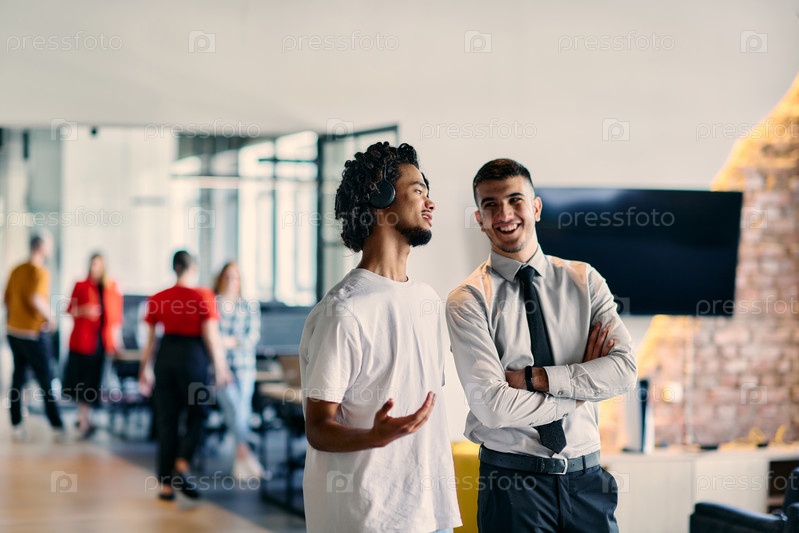 Группа коллег, в том числе афроамериканский бизнесмен и молодой лидер в рубашке и галстуке, позируют вместе в современном офисе коворкинг-центра, представляя собой динамичное сочетание профессионализма и сотрудничества