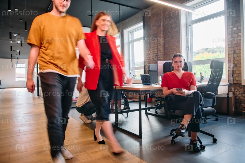 Разнообразная группа бизнес-профессионалов сотрудничает в современном коворкинг-центре для стартапов, используя сочетание бумажных и технологических инструментов, таких как мобильные телефоны и компьютеры