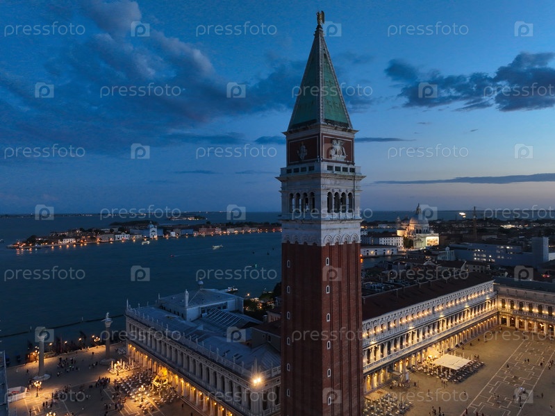 Панорамная достопримечательность Венеции на закате или ночью, вид с воздуха на площадь Сан-Марко