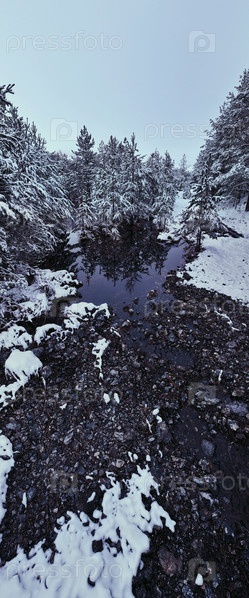 Удивительный кинематографический вид с воздуха на замерзающую реку. Аэрофотоснимок полета над замерзшим ручьем, живописный вид на природу