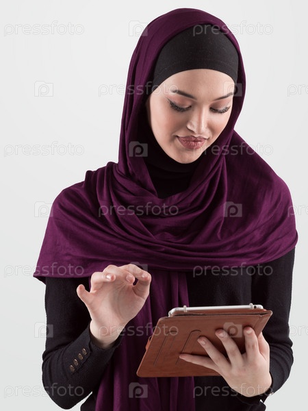 Красивая и современная молодая арабская бизнесвумен в хиджабе, использующая планшетный компьютер, позирующая на светлом фоне и улыбающаяся в камеру. Концепция разнообразия бизнеса, мусульманка