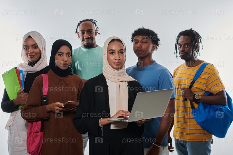 Группа разнообразных студентов занимается современными образовательными практиками, используя различные технологические инструменты, такие как ноутбуки, планшеты и смартфоны, на чистом белом фоне, иллюстрируя современный подход к совместному обучению и до