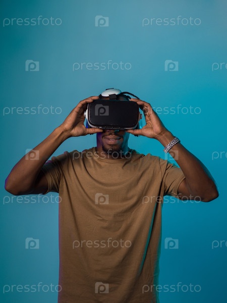 В футуристическом изображении афроамериканец стоит изолированно на ярком синем фоне, украшенный очками виртуальной реальности, которые переносят его в передовую виртуальную реальность, объединяя технологии и инновации на современном дисплее