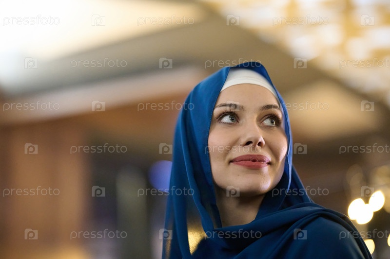 В современном ресторане красивая европейская мусульманка изящно наслаждается атмосферой и кулинарными изысками во время священного месяца Рамадан, воплощая элегантность и духовное спокойствие среди культурного праздника