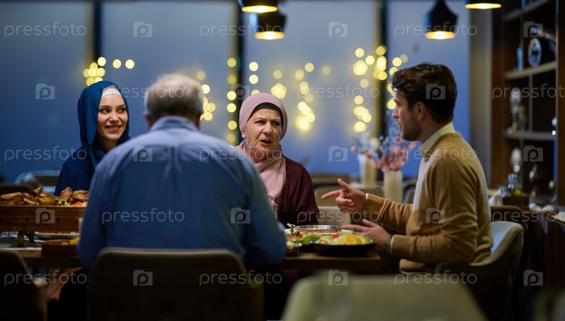 Современная и традиционная европейская исламская семья собирается вместе на ифтар в современном ресторане во время поста Рамадан, олицетворяя культурную гармонию и семейное единство среди кулинарного праздника разнообразия