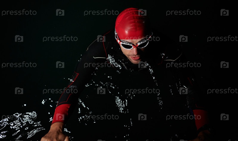Триатлонист находит безмятежное восстановление сил в озере, купаясь в спокойной воде после интенсивной тренировки