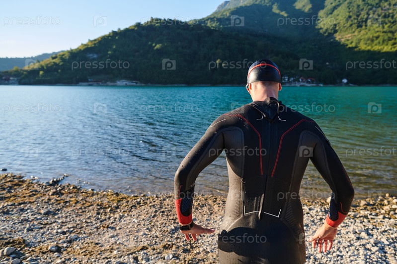 Настоящий спортсмен по триатлону готовится к тренировке по плаванию на озере