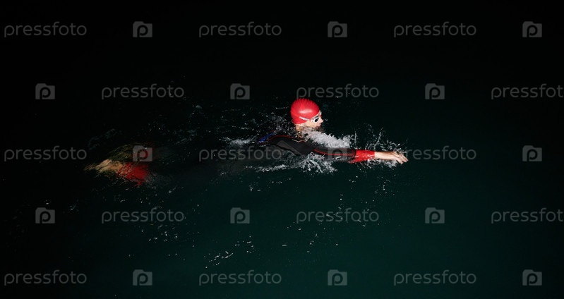 Решительный профессиональный триатлонист проходит тщательную ночную тренировку в холодной воде, демонстрируя преданность делу и стойкость в подготовке к предстоящим соревнованиям по триатлону по плаванию