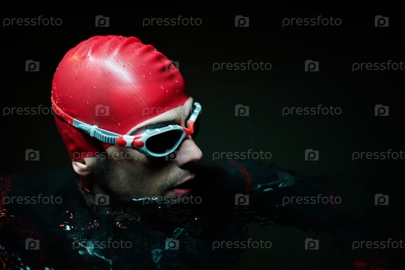 Настоящий пловец-триатлет, отдыхающий во время тяжелых тренировок при ночном неоновом гелевом свете
