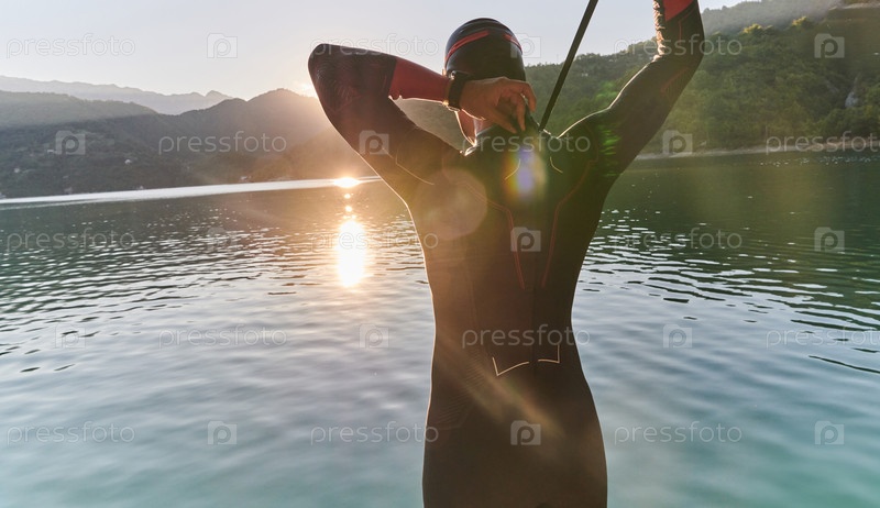 Настоящий спортсмен по триатлону готовится к тренировке по плаванию на озере