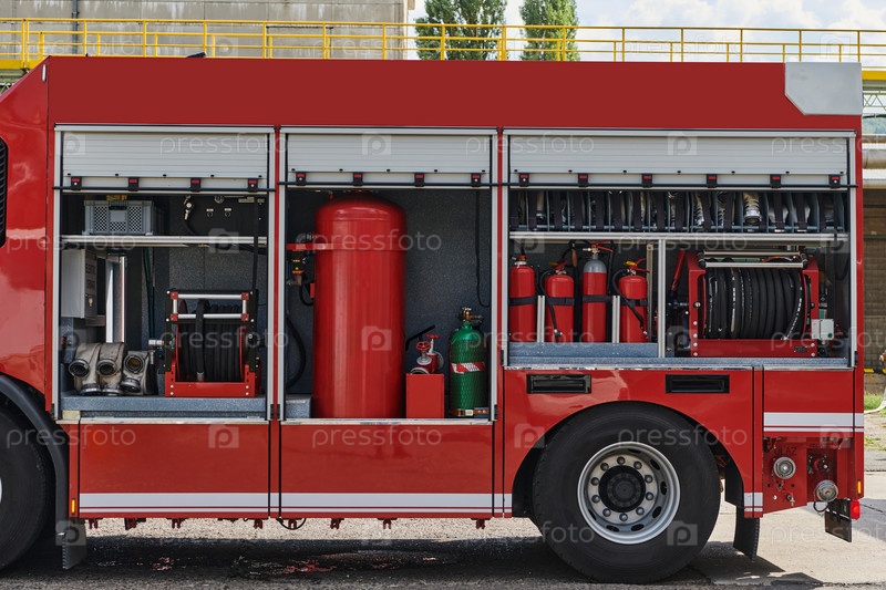 Крупный план основного противопожарного оборудования на современной пожарной машине, демонстрация инструментов и снаряжения, готовых к экстренному реагированию на опасные пожарные ситуации