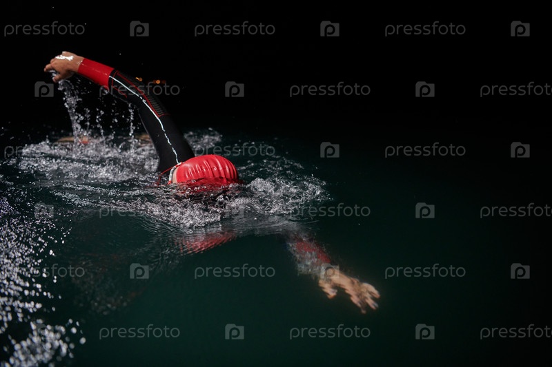 Решительный профессиональный триатлонист проходит тщательную ночную тренировку в холодной воде, демонстрируя преданность делу и стойкость в подготовке к предстоящим соревнованиям по триатлону по плаванию