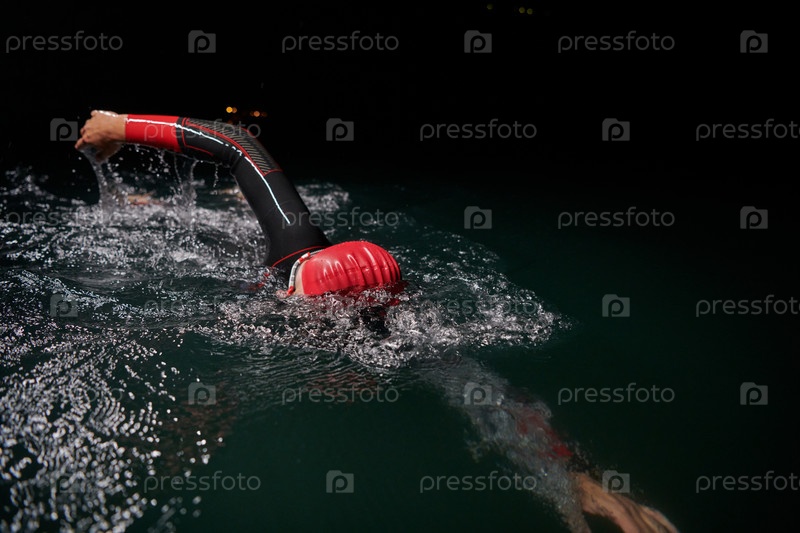 Решительный профессиональный триатлонист проходит тщательную ночную тренировку в холодной воде, демонстрируя преданность делу и стойкость в подготовке к предстоящим соревнованиям по триатлону по плаванию