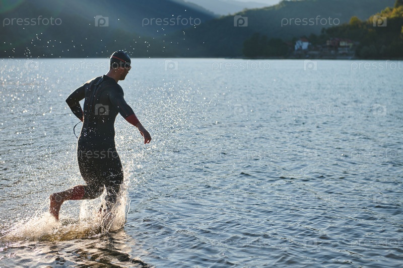 Спортсмен по триатлону начинает тренировку по плаванию на озере