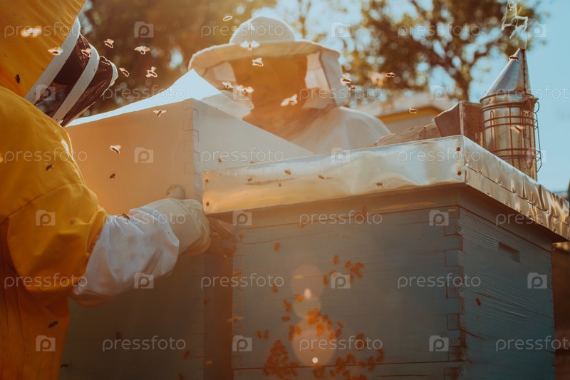 Пчеловоды проверяют мед на рамке улья в поле. Владельцы малого бизнеса на пасеке. Производитель натуральных здоровых продуктов питания работает с пчелами и ульями на пасеке