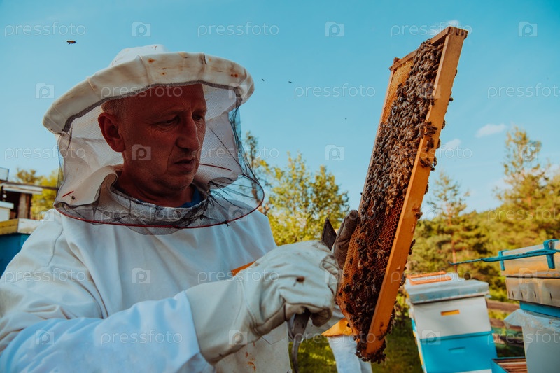 Пчеловод проверяет мед на рамке улья в поле. Владелец малого бизнеса на пасеке. Производитель натуральных здоровых продуктов питания работает с пчелами и ульями на пасеке
