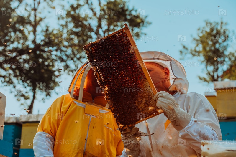 Пчеловоды проверяют мед на рамке улья в поле. Владельцы малого бизнеса на пасеке. Производитель натуральных здоровых продуктов питания работает с пчелами и ульями на пасеке