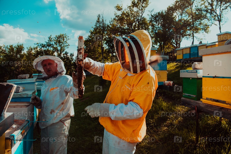 Пчеловоды проверяют мед на рамке улья в поле. Владельцы малого бизнеса на пасеке. Производитель натуральных здоровых продуктов питания работает с пчелами и ульями на пасеке