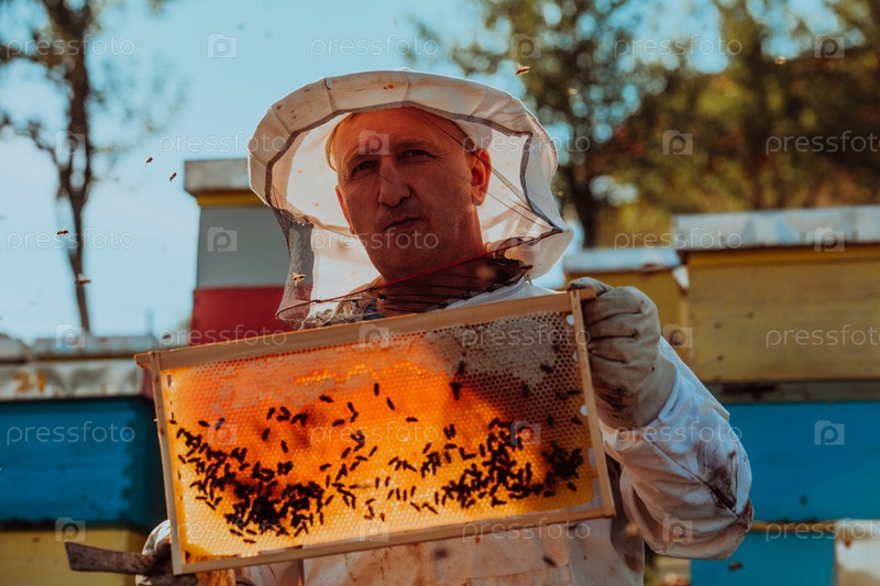 Пчеловод проверяет мед на рамке улья в поле. Владелец малого бизнеса на пасеке. Производитель натуральных здоровых продуктов питания работает с пчелами и ульями на пасеке