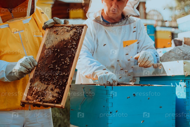 Пчеловоды проверяют мед на рамке улья в поле. Владельцы малого бизнеса на пасеке. Производитель натуральных здоровых продуктов питания работает с пчелами и ульями на пасеке