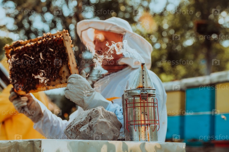 Пчеловод проверяет мед на рамке улья в поле. Пчеловод на пасеке. Пчеловод работает с пчелами и ульями на пасеке