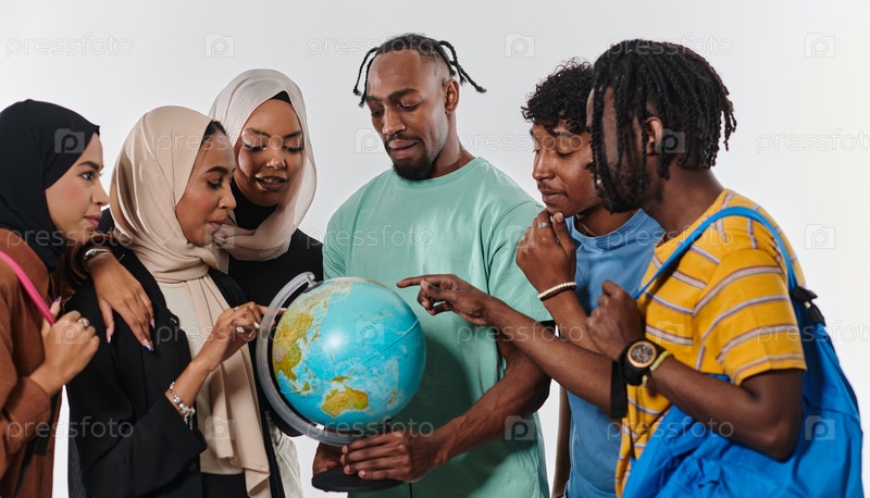 Разнообразная группа студентов собралась по всему миру, поглощенная исследованиями и учебой, их яркая энергия запечатлена на первозданном белом фоне, символизируя единство и любопытство в их образовательном путешествии