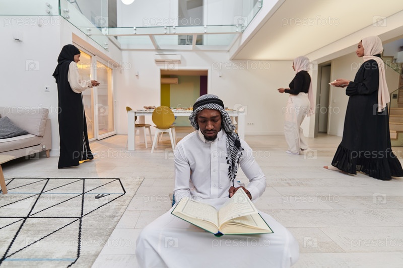В священный месяц Рамадан афроамериканец-мусульманин, поглощенный чтением Священного Корана, окружен фоном, на котором три женщины в хиджабе готовят и подают еду для ифтара, изображая сцену духовной преданности, культурного единства и общественного праздн