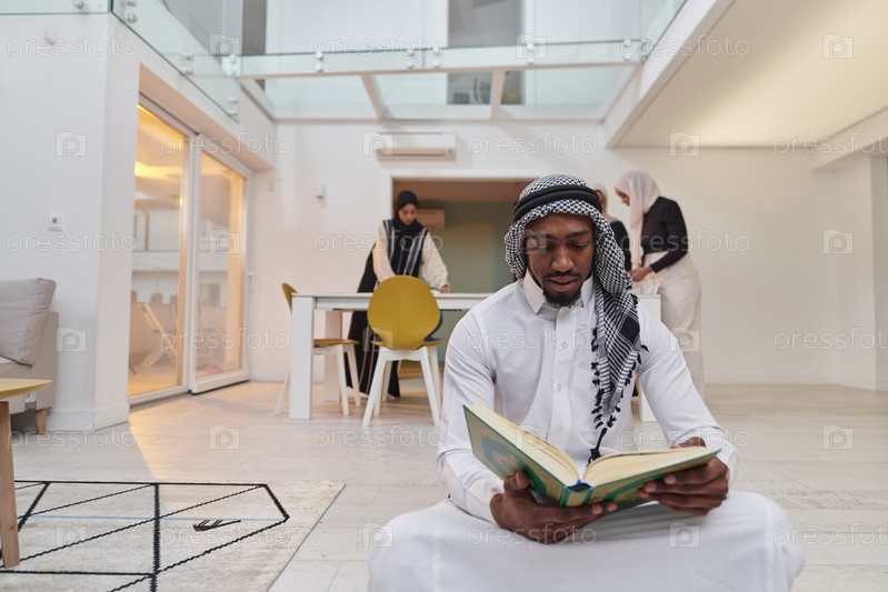 В священный месяц Рамадан афроамериканец-мусульманин, поглощенный чтением Священного Корана, окружен фоном, на котором три женщины в хиджабе готовят и подают еду для ифтара, изображая сцену духовной преданности, культурного единства и общественного праздн
