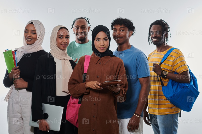 Группа разнообразных студентов занимается современными образовательными практиками, используя различные технологические инструменты, такие как ноутбуки, планшеты и смартфоны, на чистом белом фоне, иллюстрируя современный подход к совместному обучению и до
