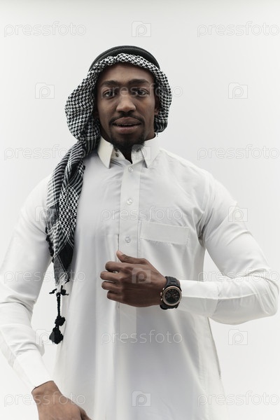 Арабский предприниматель делает автопортрет на изолированном белом фоне, излучающий амбиции, решимость и корпоративную харизму, олицетворяющий сущность успешного и влиятельного бизнес-лидера
