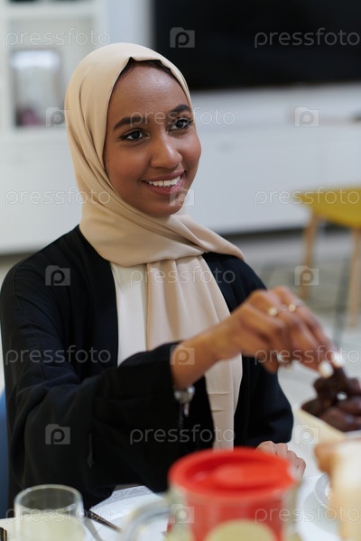 Молодая мусульманка, одетая в хиджаб, деликатно берет свидания, символизируя прекращение ее поста в священный месяц Рамадан, воплощая в себе сцену духовных размышлений, культурных традиций и ожидания совместного ифтара