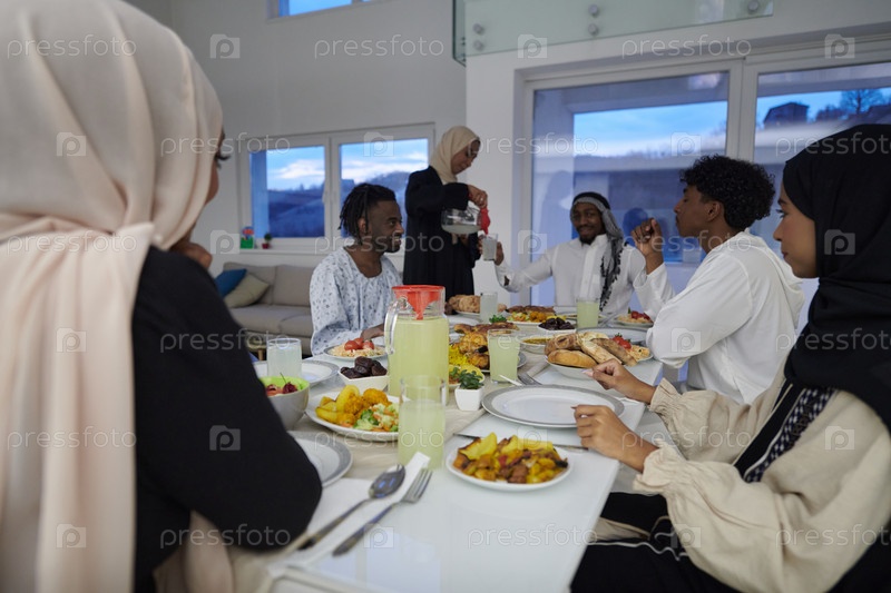 В священный месяц Рамадан мусульманская семья радостно собирается за столом, с нетерпением ожидая общего ифтара, участвуя в приготовлении общей трапезы и объединяясь в ожидании коллективной молитвы, воплощая дух единения, преданности и культурный праздник