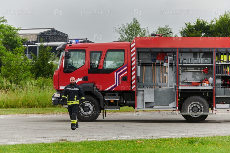 Пожарный тщательно готовит современную пожарную машину к миссии по эвакуации и реагированию на опасные ситуации, демонстрируя максимальную приверженность безопасности и готовности перед лицом чрезвычайной ситуации с пожаром