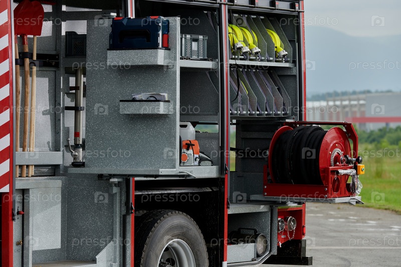 На этом подробном изображении крупным планом высокотехнологичный спасательный инструмент, тщательно размещенный в современных пожарных машинах, демонстрирует точность и инновации в спасательном оборудовании, подчеркивая передовые технологии и готовность,