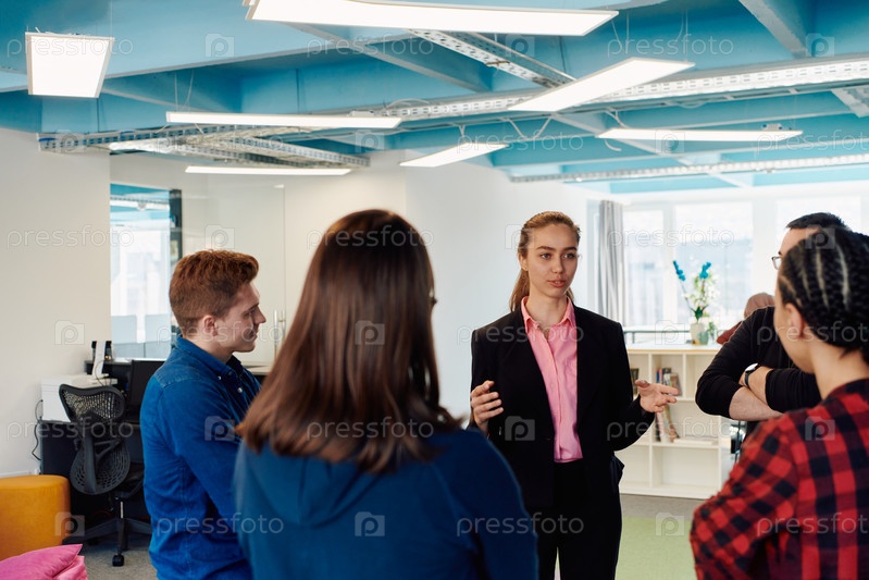 Разнообразная команда молодых бизнесменов, обменивающихся идеями в современном стартап-офисе