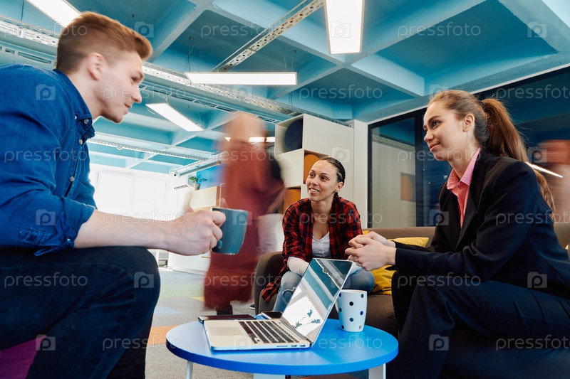 Многонациональная стартап-бизнес-команда встречается в современном ярком коворкинг-офисе под открытым небом. Мозговой штурм, работа на ноутбуке. Группа коллег ходит в размытом состоянии