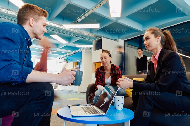 Многонациональная стартап-бизнес-команда встречается в современном ярком коворкинг-офисе под открытым небом. Мозговой штурм, работа на ноутбуке. Группа коллег ходит в размытом состоянии