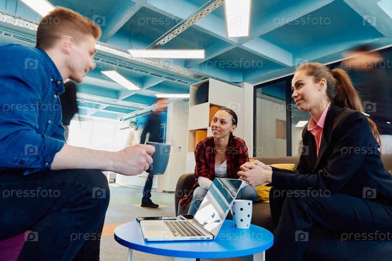 Многонациональная стартап-команда встречается в современном ярком коворкинг-офисе под открытым небом. Мозговой штурм, работа на ноутбуке. Группа коллег ходит в размытом состоянии