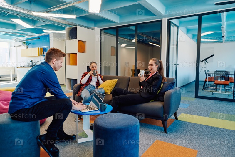 Многонациональная стартап-команда встречается в современном ярком коворкинг-офисе под открытым небом. Мозговой штурм, работа на ноутбуке. Группа коллег ходит в размытом состоянии
