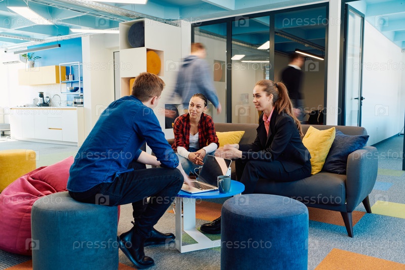 Многонациональная стартап-команда встречается в современном ярком коворкинг-офисе под открытым небом. Мозговой штурм, работа на ноутбуке. Группа коллег ходит в размытом состоянии