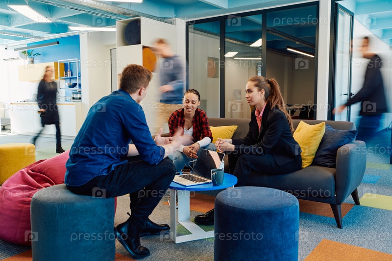 Многонациональная стартап-бизнес-команда встречается в современном ярком коворкинг-офисе под открытым небом. Мозговой штурм, работа на ноутбуке. Группа коллег ходит в размытом состоянии