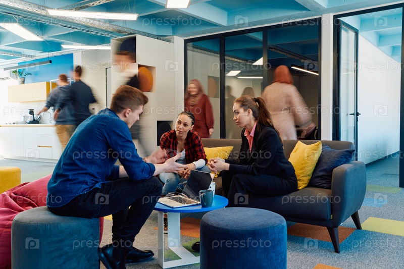 Многонациональная стартап-бизнес-команда встречается в современном ярком коворкинг-офисе под открытым небом. Мозговой штурм, работа на ноутбуке. Группа коллег ходит в размытом состоянии