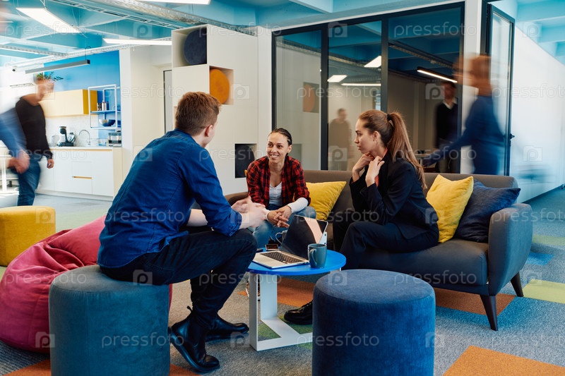 Многонациональная стартап-бизнес-команда встречается в современном ярком коворкинг-офисе под открытым небом. Мозговой штурм, работа на ноутбуке. Группа коллег ходит в размытом состоянии