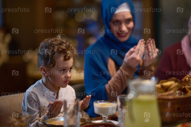 В современном ресторане европейская исламская семья собирается вместе на ифтар во время Рамадана, молясь перед едой, объединяя традиции и современные практики в праздник веры и семьи