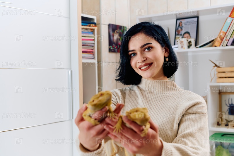 Красивая женщина позирует со своими двумя очаровательными бородатыми драконами