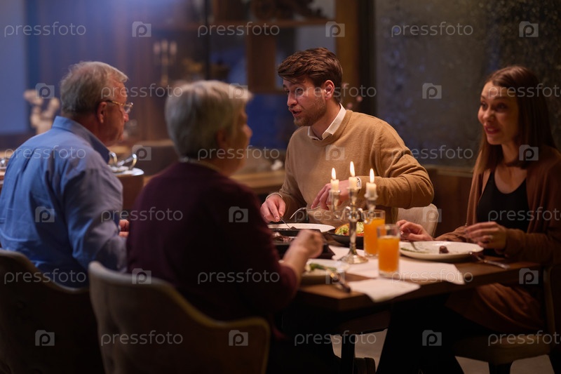 Современная и традиционная европейская исламская семья собирается вместе на ифтар в современном ресторане во время поста Рамадан, олицетворяя культурную гармонию и семейное единство среди кулинарного праздника разнообразия