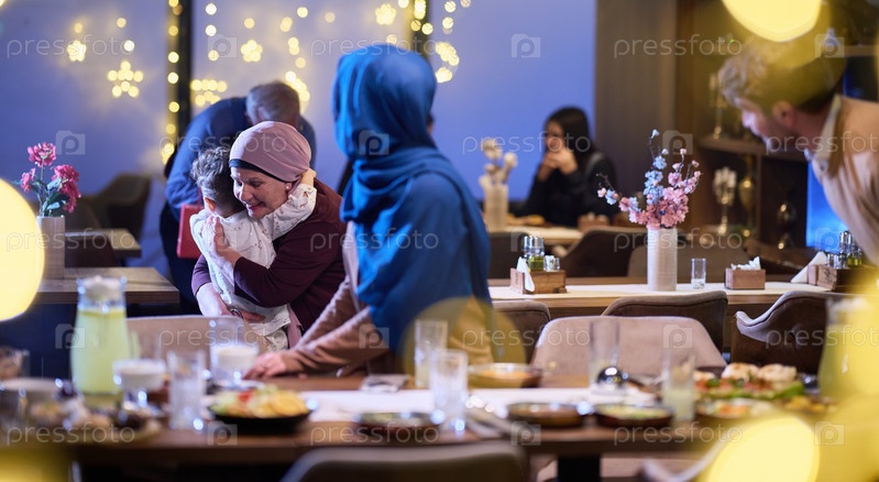 Бабушки и дедушки приходят на встречу своих детей и внуков на ифтар в ресторане во время священного месяца Рамадан, неся подарки и делясь заветными моментами любви, единения и культурного обмена, с нетерпением ожидая совместной трапезы