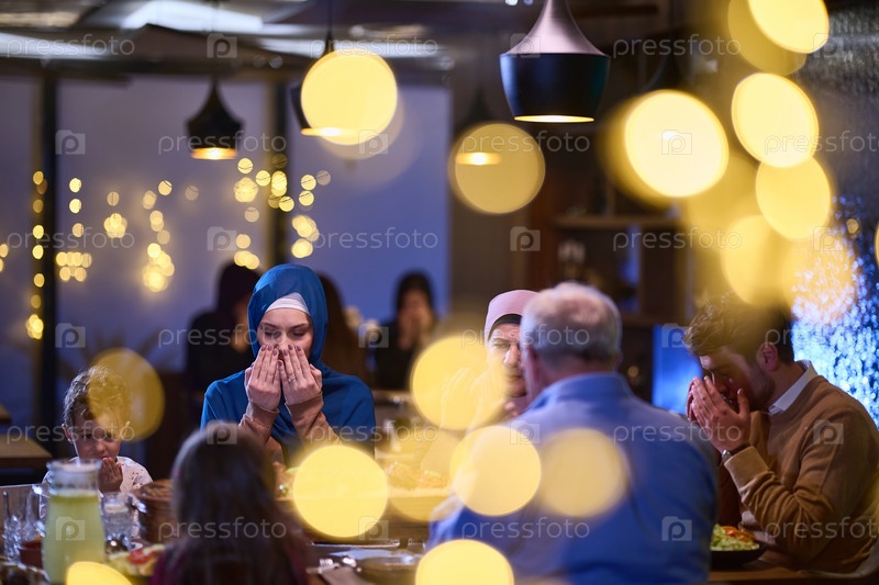 В современном ресторане европейская исламская семья собирается на ифтар во время Рамадана, молясь перед едой, объединяя традиции и современные практики в праздник веры и семьи