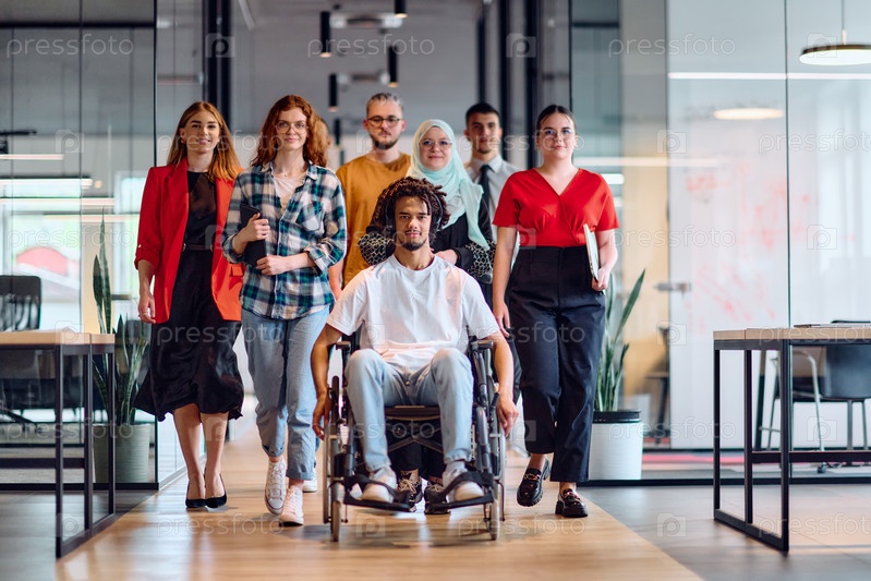 Разнообразная группа молодых бизнесменов, идущих по коридору в застекленном офисе современного стартапа, включая человека в инвалидной коляске и женщину в хиджабе