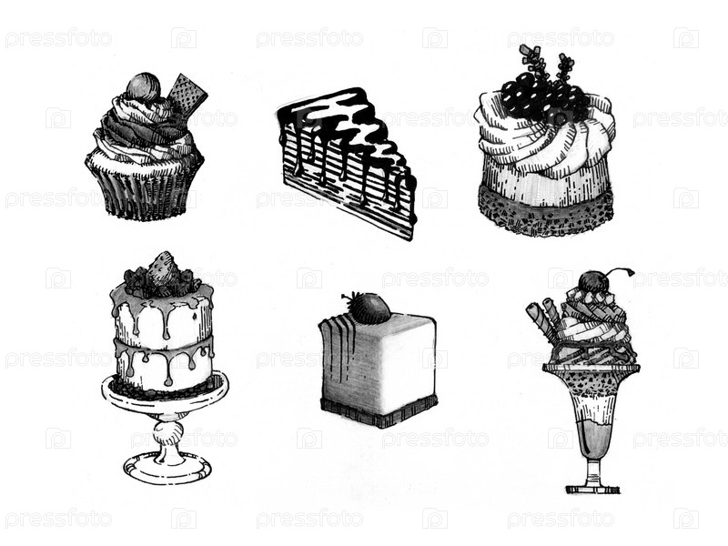 Десерт, рисунок от руки тушью на белом фоне, набор